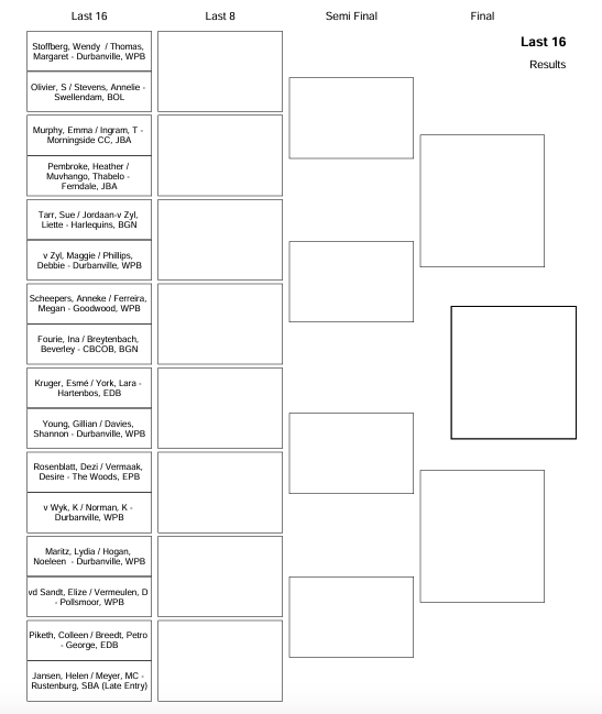 Not to miss out on the high-profile names advancing was Colleen Piketh, fresh off of her bronze in the BSA Masters. She has Petro Breedt as her teammate this week and they are through to face Helen Jansen and MC Meyer from Rustenburg.