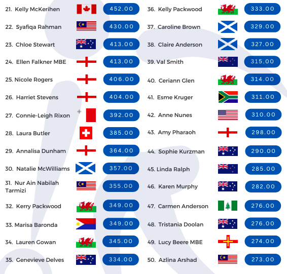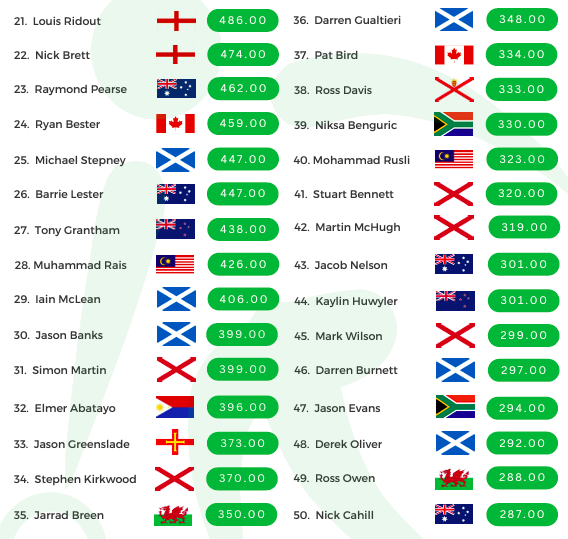 A full list of the top 50 players from the Official World Rankings are now live on the World Bowls Series website – www.worldbowlsseries.com – with information on the events that have contributed to these rankings also available.